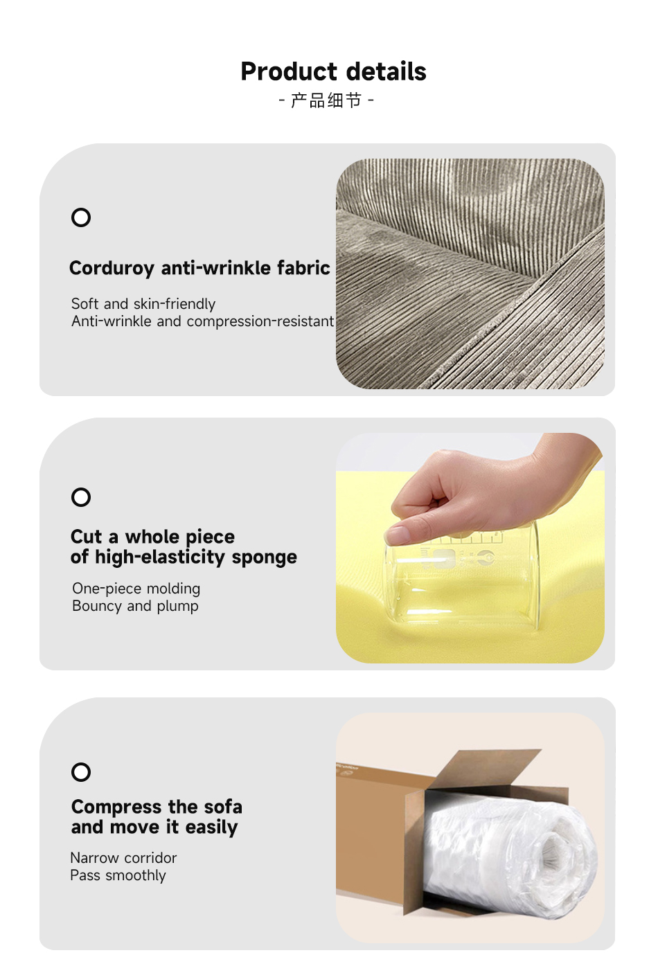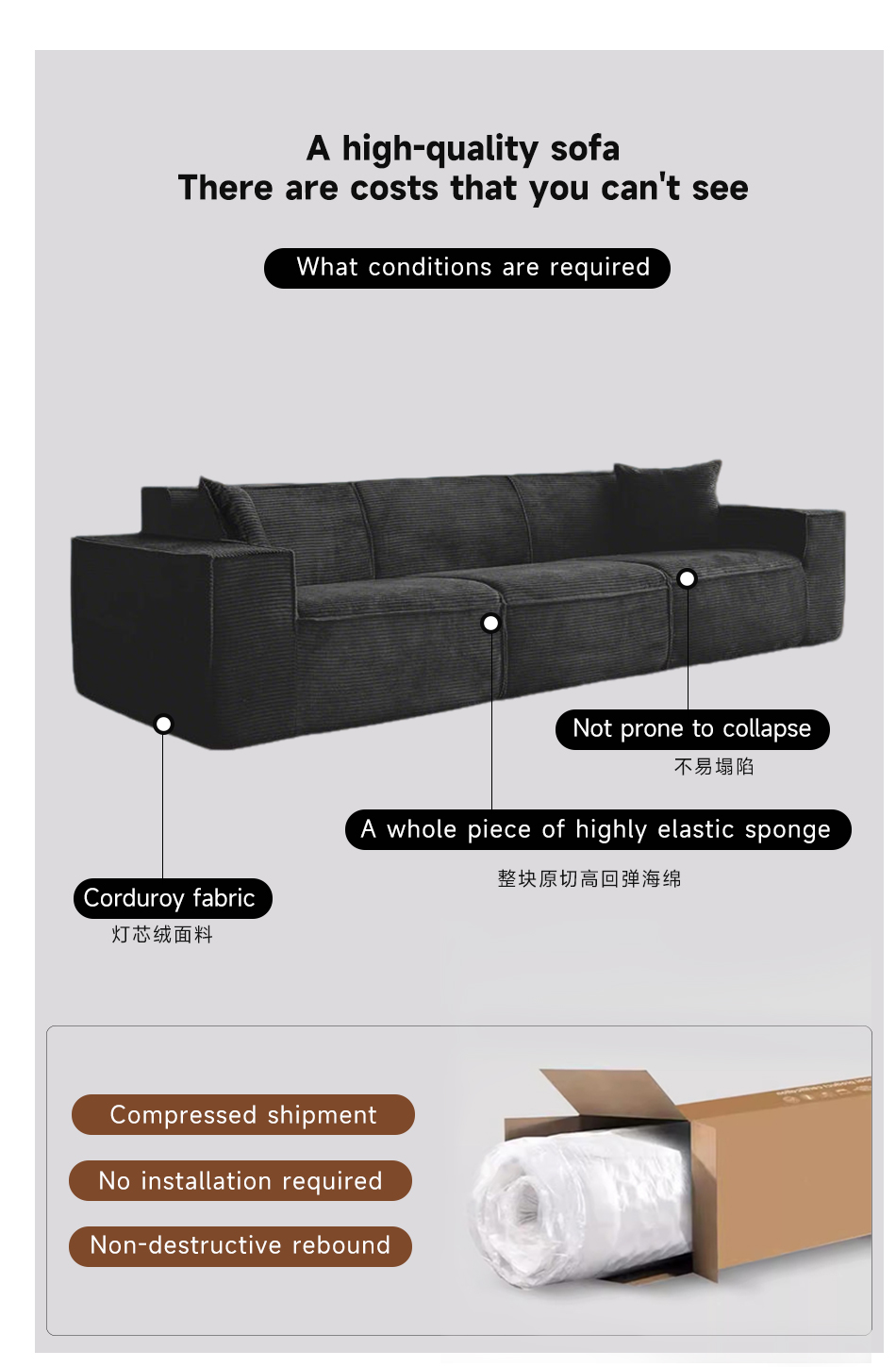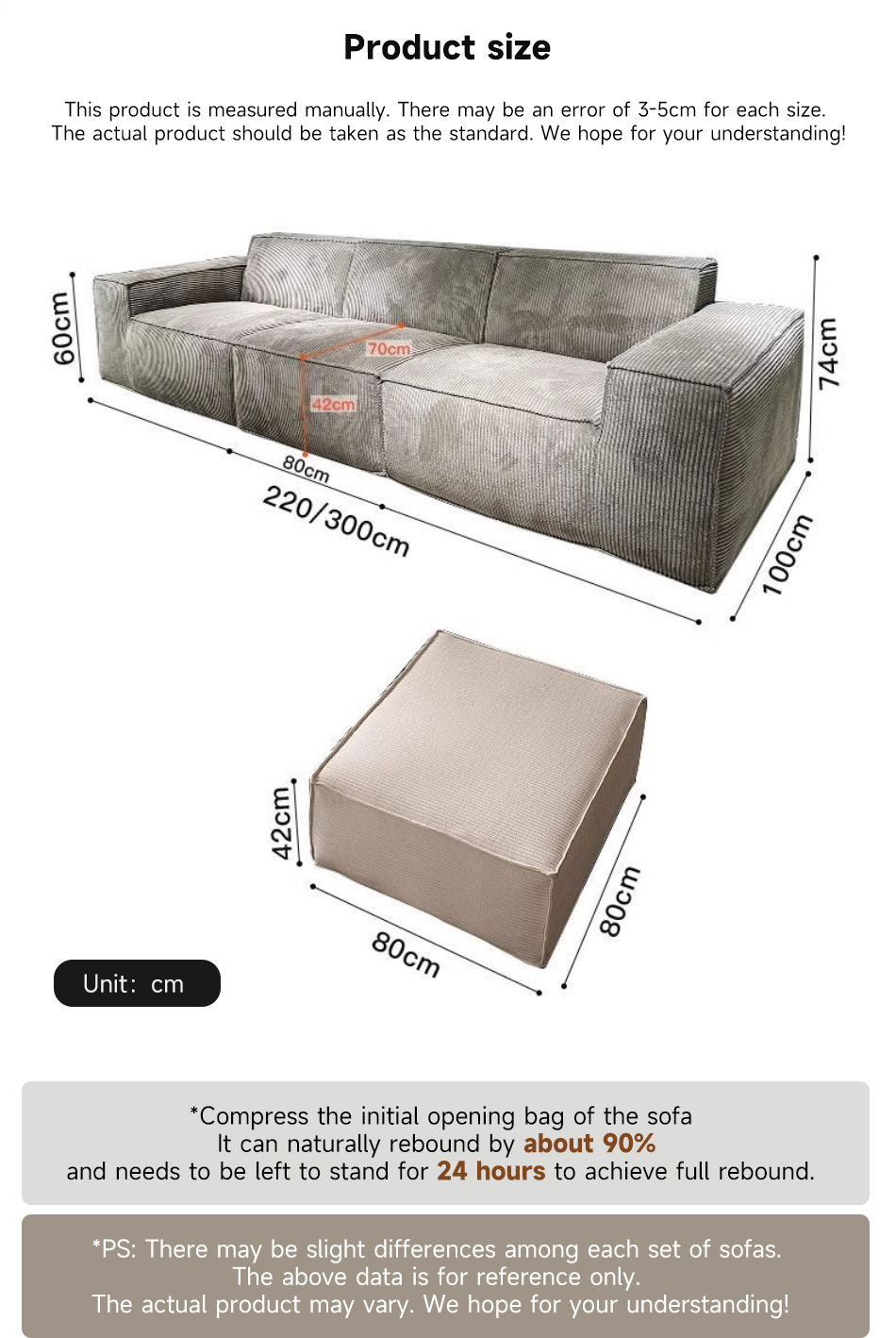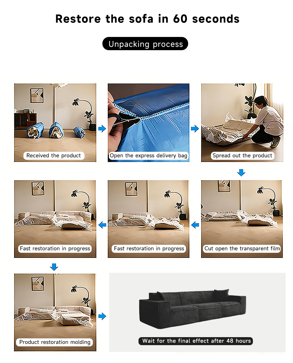 *Compress the initial opening bag of the sofa It can naturally rebound by about 90% and needs to be left to stand for 24 hours to achieve full rebound.