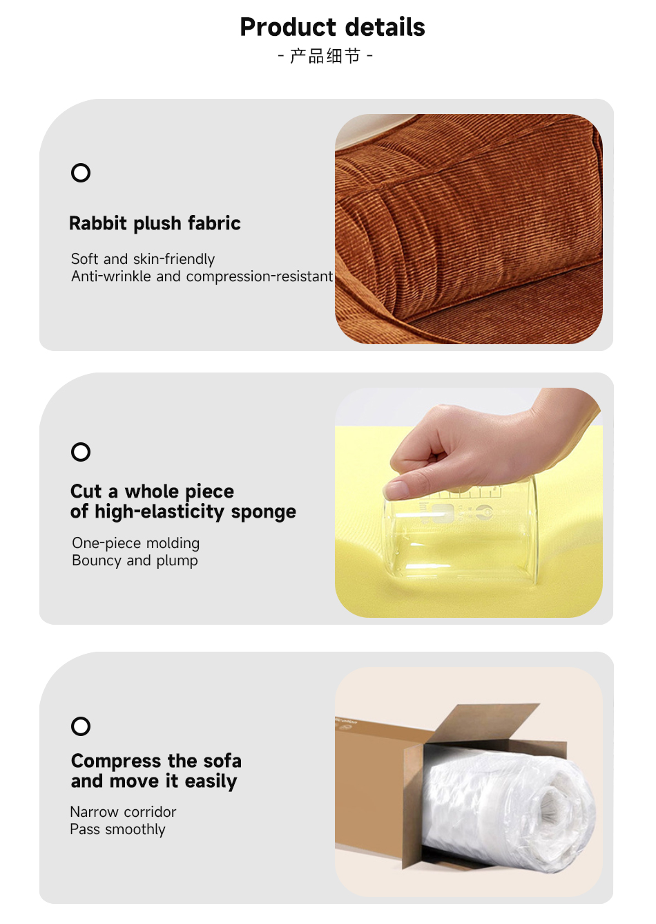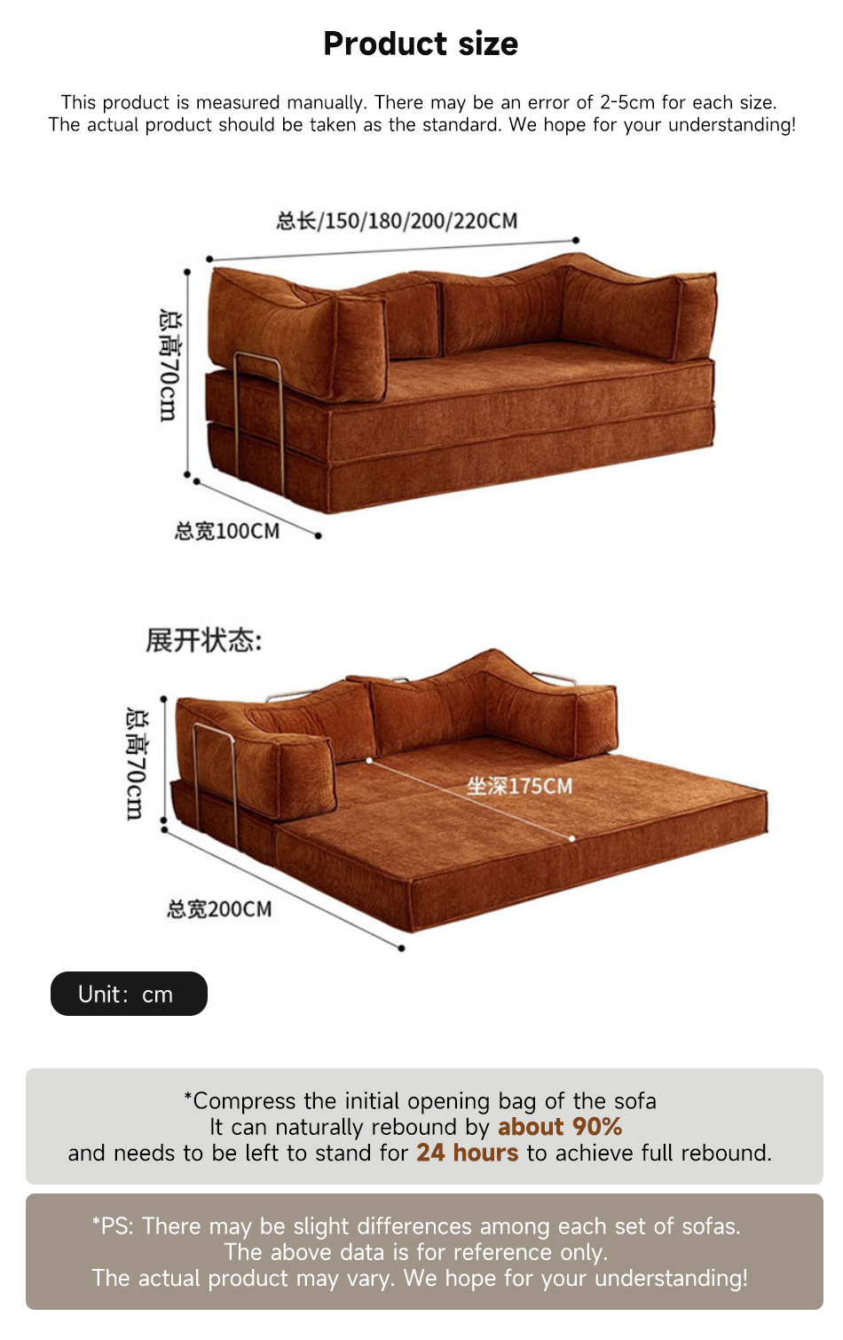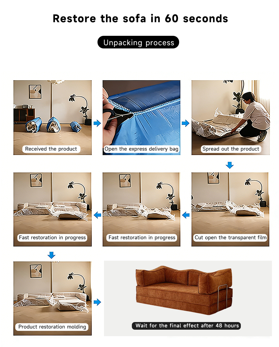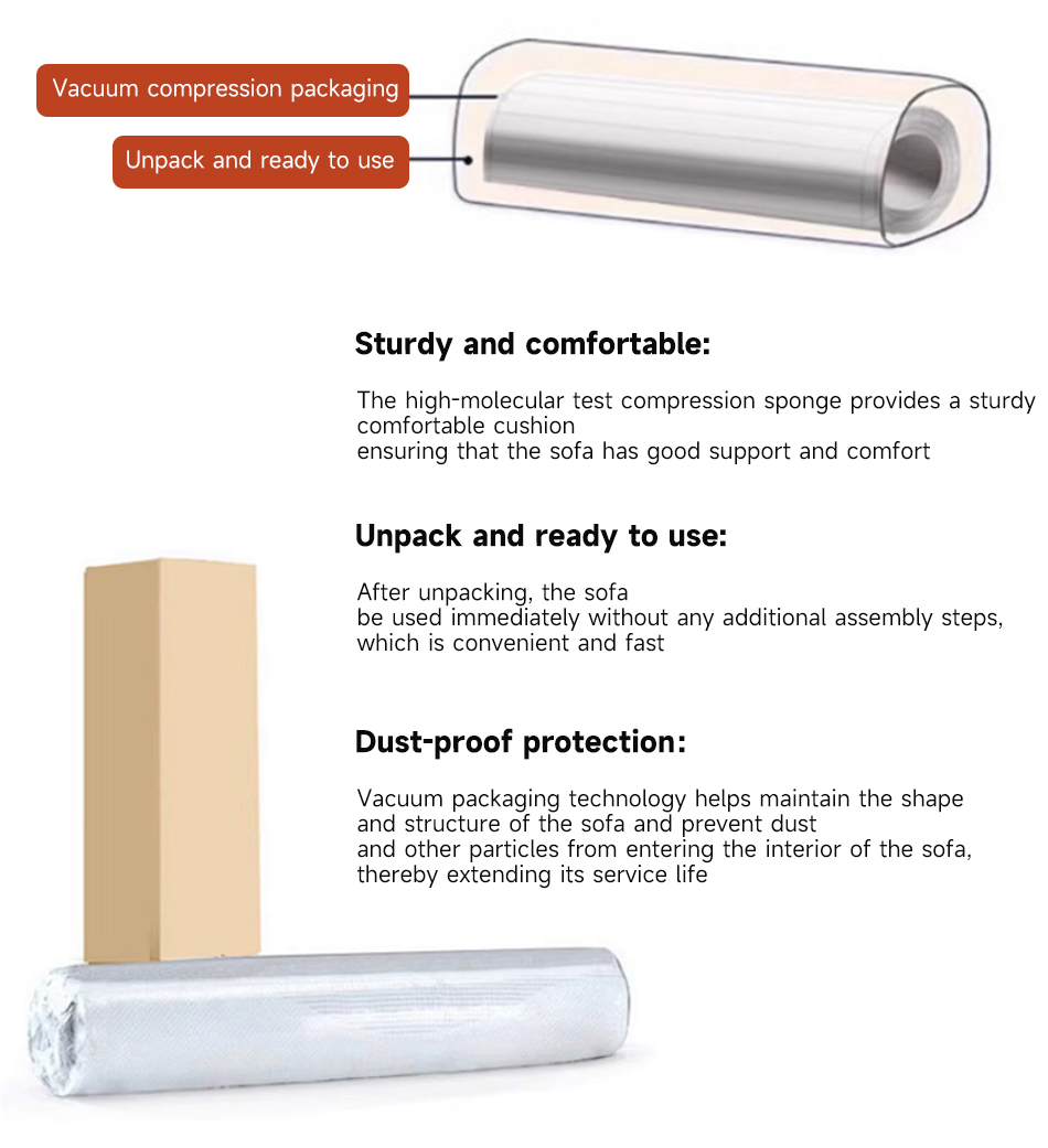 *Compress the initial opening bag of the sofa It can naturally rebound by about 90% and needs to be left to stand for 24 hours to achieve full rebound.